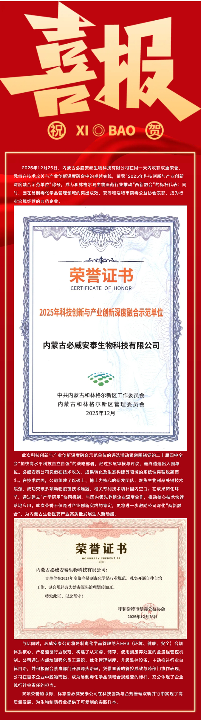 必威安泰再添新彩!榮獲“2025年科技創(chuàng)新與產(chǎn)業(yè)創(chuàng)新深度融合示范單位”稱(chēng)號(hào)及呼和浩特市禁毒公益協(xié)會(huì)表彰