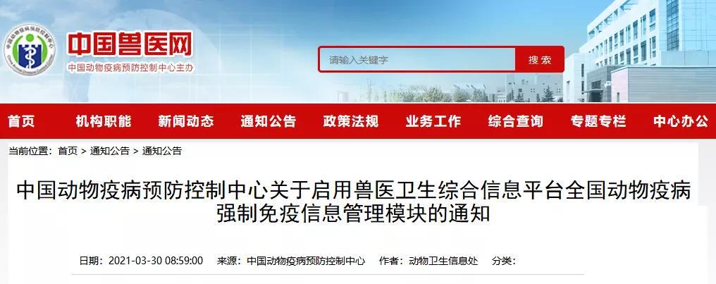 中國動物疫病預(yù)防控制中心啟用獸醫(yī)衛(wèi)生綜合信息平臺全國動物疫病強(qiáng)制免疫信息管理模塊