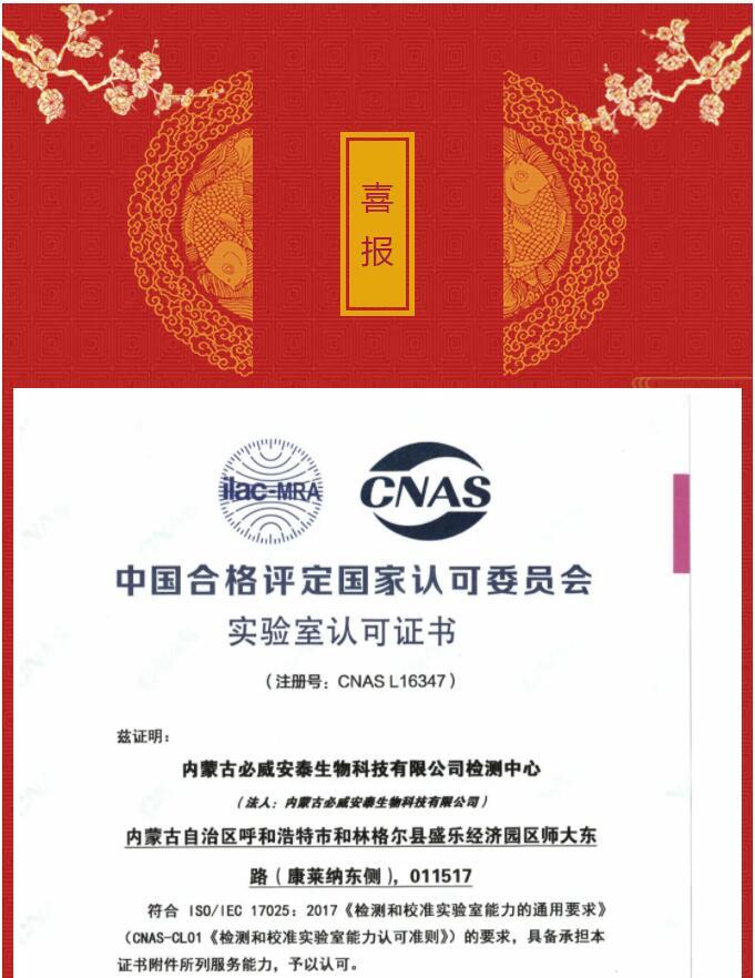 內(nèi)蒙古必威安泰生物科技有限公司檢測中心獲CNAS實(shí)驗(yàn)室認(rèn)可